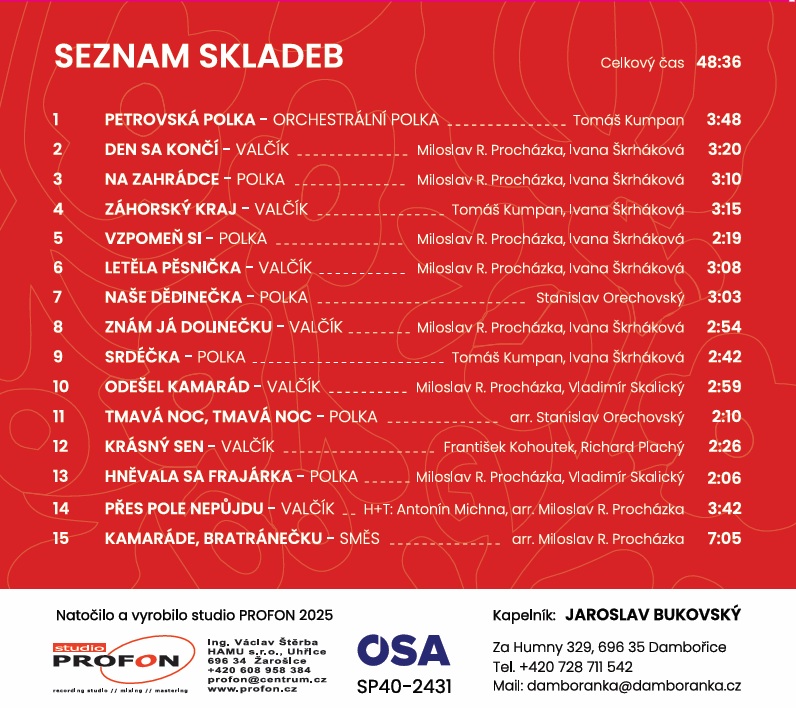 | Petrovská polka (Tomáš Kupan) Den se končí (M.R.Procházka / Ivana Škrháková) Na zahrádce (M.R. Procházka / Ivana Škrháková) Záhorský kraj (Tomáš Kupan / Ivana Škrháková) Vzpomeň si (M.R. Procházka / Ivana Škrháková) Letěla pěsnička (M.R. Procházka / Ivana Škrháková) Naša dědinečka (Stanislav Orechovský) Znám já dolinečku (M.R. Procházka / Ivana Škrháková) Srdéčka (Tomáš Kupan / Ivana Škrháková) Odešel kamarád (M.R. Procházka / Vladimír Skalický) Tmavá noc (arr. Stanislav Orechovský) Krásný sen (František Kohoutek / Richard Plachů) Hněvala sa frajárka (M.R. Procházka / Vladimír Skalický) Přes pole nepůjdu (H+T: Antonín Michna, arr. M.R. Procházka) Kamaráde, bratránečku (arr. M.R. Procházka) |